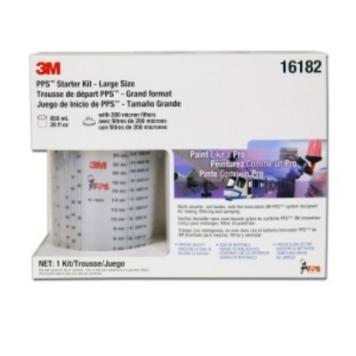 3M™ PPS™ Starter Kit: Large Size (850mL, 28 fl oz): 6-Pack disposable Lids & Liners with 200 micron filters;1-Cup & Collar; 1 bag of Sealing Plugs; and 1-generic mix ratio insert for Automotive over the counter sales. -