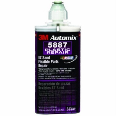 3M™ Automix™ EZ Sand Flexible Repair material offers a 10 minute worktime and can be sanded with grade 180 abrasives in 30 minutes resulting in an excellent featheredge. The convenient self mixing feature of part number 05887 ensures proper product ratio everytime, increasing productivity. It is recommended that 3M's Polyolefin Adhesion Promoter 05907 be used when working with polypropylene and ethylene propylene interior and exterior parts. There are two recommended applicator guns. They are the MixPac® Manual Applicator 08117