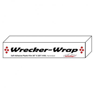 Wrecker-Wrap is a self-adhesive weather barrier plastic film that protects the interior and body of vehicles. It seals out rain, dirt and snow. Vehicles involved in collisions which require protection from the weather due to damage or removed windows and doors can be temporarily sealed with Wrecker-Wrap.