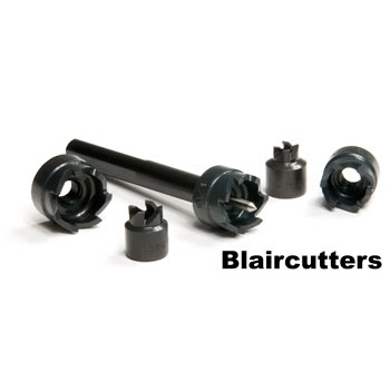 For low cost sheet metal holemaking. Blaircutters provide fast, accurate, burr-free holes in materials up to 3/16" thick. Light-duty Blaircutters are annular cutting tools that cut around the edge of the hole and eject the center as a slug. Because they're hollow, there's no dead zone as with twist drills. Unlike hole saws, that rip and tear through the material, they quickly give you a quality, virtually burr-free hole. Blaircutters are available in seven sizes for 1/4" and larger drill chucks. Spring loaded pilot "pops" the slug from the cutter.