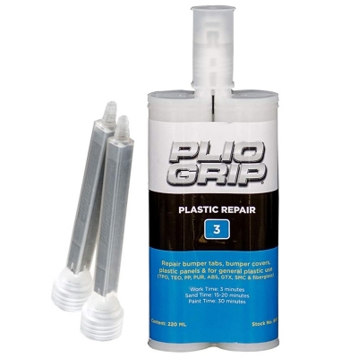 PLIOGRIP Repair #3 is used for repair of plastic panels and bumpers, TPO, TEO, PP, PUR, AB S, GTX, Bonding of SMC, and fiberglass. 220ml cartridge Work Time: 3.5 minutes Sand Time: 15-20 min or 3-5 min at 140F Paint Time: 30 minutes