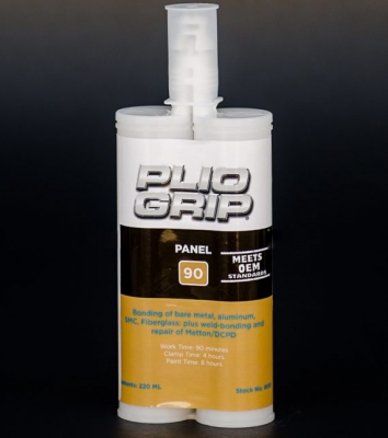 Panel 90 The PlioGrip 7700 urethane system has been approved by the leading OEMs for panel replacement on SMC hoods for more than 30 years, and its PlioGrip OEM cousins are used in the factory on more than 90% of SMC/Fiberglass hoods on the road today. Bond Aluminum, Metal and SMC/Fiberglass, Door Skins, Quarter Panels, Body Panels, Roof Skins, Bedsides Can be welded and rivet bonded Two work times are available for greater flexibility Work Time: 90 minutes Handling Strength: 4 hours at R/T, 10-15 min at 180F Paint Time: 8 hours at R/T, 25-30 min at 180F Sizes Available: 220ml – Stock #8051 400ml – Stock #5760 **Includes Corrosion Warranty