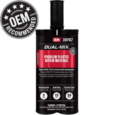 Dual-Mix™ Problem Plastic Repair Material is a two-component epoxy based filler for repairing olefin-based plastics and similar rigid and semi-rigid substrates.