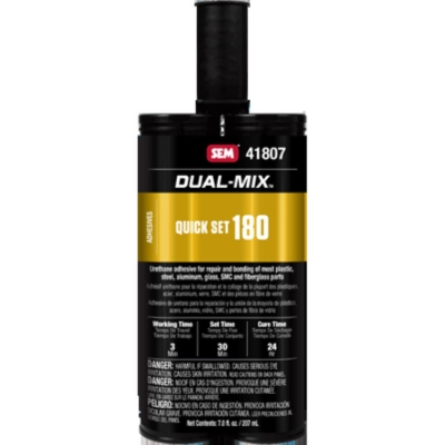 Dual-Mix Quick Set 180 is a two-component, general purpose, black, urethane adhesive with a three minute working time designed for repairing and bonding most small to medium plastic, steel, aluminum, glass, SMC and fiberglass parts.