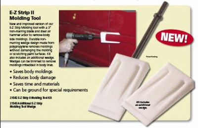 E-Z Strip II Molding Tool New and improved version of our E-Z Strip Molding tool with a 3” non-marring blade and steel air hammer arbor to remove body side moldings. Durable nonmarring wedge design made from polypropylene removes moldings without damanging the molding or scratching paint surfaces. Kit also includes an additional wedge. Wedges can be trimmed to remove moldings imbedded in body lines